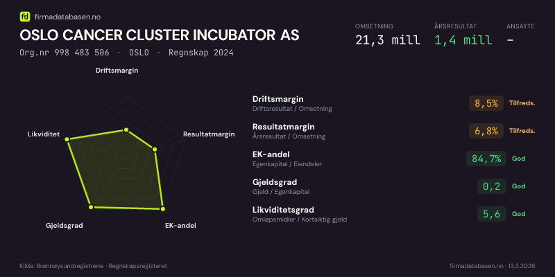 OSLO CANCER CLUSTER INCUBATOR AS hadde en omsetning på 21,3 MNOK for regnskapsåret 2024 ifølge siste innsendte årsregnskap. Regnskapstallene hentes fra Brønnøysundregistrene.