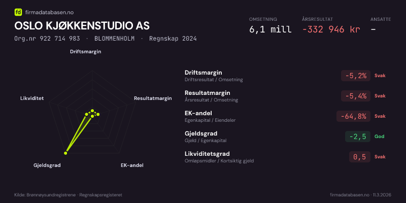 OSLO KJØKKENSTUDIO AS hadde en omsetning på 6,1 MNOK for regnskapsåret 2024 ifølge siste innsendte årsregnskap. Regnskapstallene hentes fra Brønnøysundregistrene.