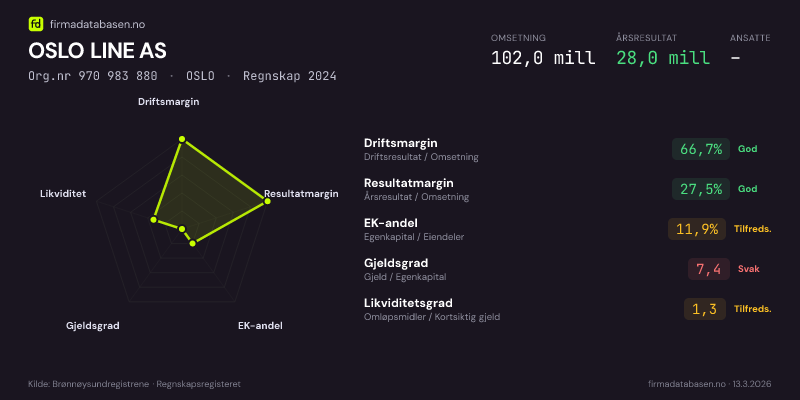 OSLO LINE AS hadde en omsetning på 102,0 MNOK for regnskapsåret 2024 ifølge siste innsendte årsregnskap. Regnskapstallene hentes fra Brønnøysundregistrene.