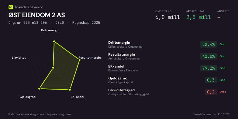 ØST EIENDOM 2 AS hadde en omsetning på 6,0 MNOK for regnskapsåret 2025 ifølge siste innsendte årsregnskap. Regnskapstallene hentes fra Brønnøysundregistrene.