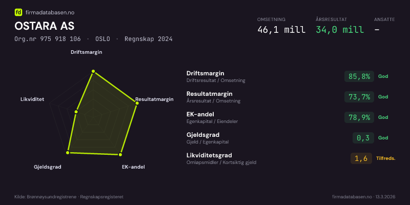 OSTARA AS hadde en omsetning på 46,1 MNOK for regnskapsåret 2024 ifølge siste innsendte årsregnskap. Regnskapstallene hentes fra Brønnøysundregistrene.