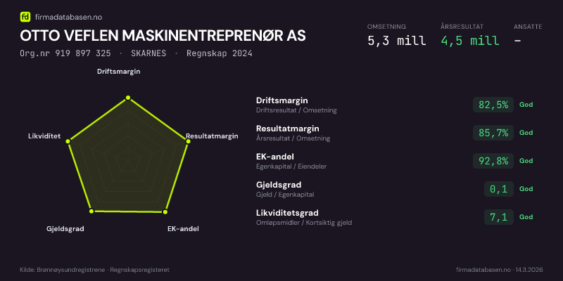 OTTO VEFLEN MASKINENTREPRENØR AS hadde en omsetning på 5,3 MNOK for regnskapsåret 2024 ifølge siste innsendte årsregnskap. Regnskapstallene hentes fra Brønnøysundregistrene.