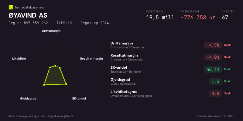 ØYAVIND AS hadde en omsetning på 19,5 MNOK for regnskapsåret 2024 ifølge siste innsendte årsregnskap. Regnskapstallene hentes fra Brønnøysundregistrene.