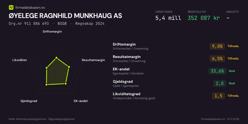 ØYELEGE RAGNHILD MUNKHAUG AS,BODØ — jo større areal, jo sterkere økonomi.Org.nr 911 886 693 · Regnskap2024