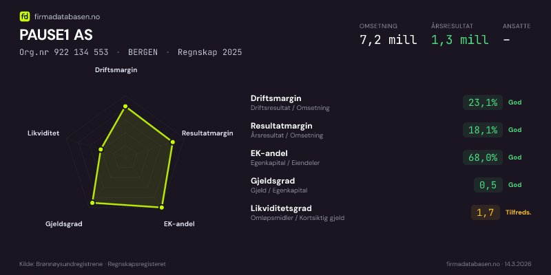 PAUSE1 AS hadde en omsetning på 7,2 MNOK for regnskapsåret 2025 ifølge siste innsendte årsregnskap. Regnskapstallene hentes fra Brønnøysundregistrene.