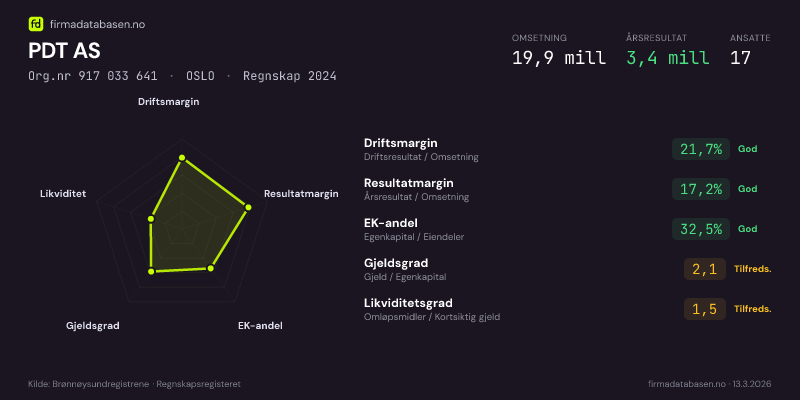 PDT AS hadde en omsetning på 19,9 MNOK for regnskapsåret 2024 ifølge siste innsendte årsregnskap. Regnskapstallene hentes fra Brønnøysundregistrene.