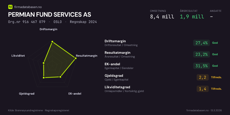 PERMIAN FUND SERVICES AS hadde en omsetning på 8,4 MNOK for regnskapsåret 2024 ifølge siste innsendte årsregnskap. Regnskapstallene hentes fra Brønnøysundregistrene.