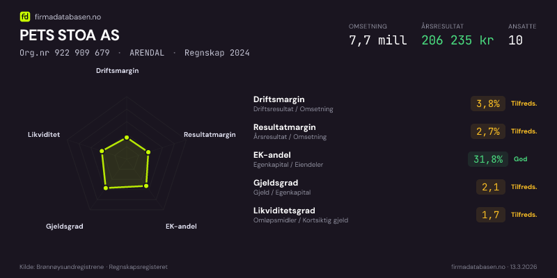PETS STOA AS hadde en omsetning på 7.7 mill i 2024, med driftsmargin på 3.8%.