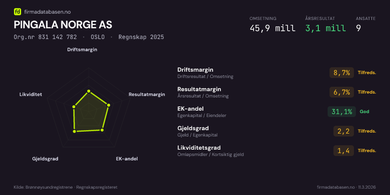 PINGALA NORGE AS hadde en omsetning på 45,9 MNOK for regnskapsåret 2025 ifølge siste innsendte årsregnskap. Regnskapstallene hentes fra Brønnøysundregistrene.