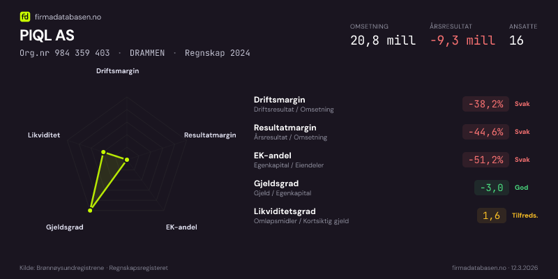 PIQL AS hadde en omsetning på 20,8 MNOK for regnskapsåret 2024 ifølge siste innsendte årsregnskap. Regnskapstallene hentes fra Brønnøysundregistrene.