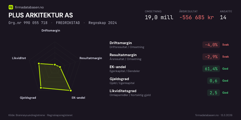 PLUS ARKITEKTUR AS hadde en omsetning på 19,0 MNOK for regnskapsåret 2024 ifølge siste innsendte årsregnskap. Regnskapstallene hentes fra Brønnøysundregistrene.