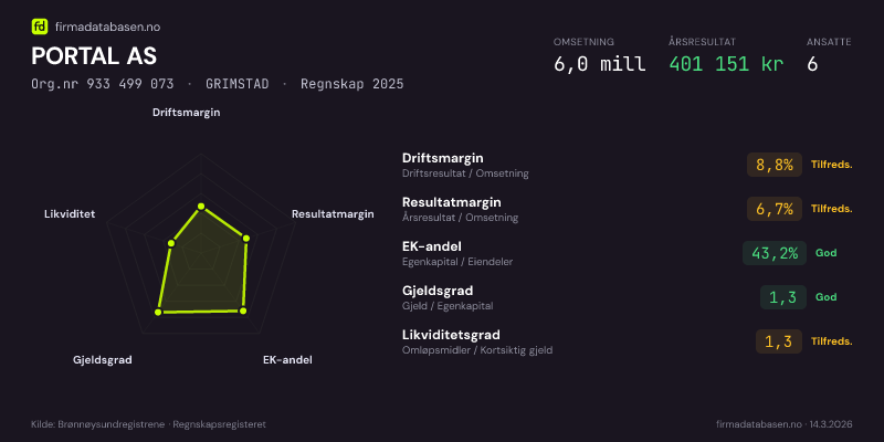 PORTAL AS hadde en omsetning på 6.0 mill i 2025, med driftsmargin på 8.8%.