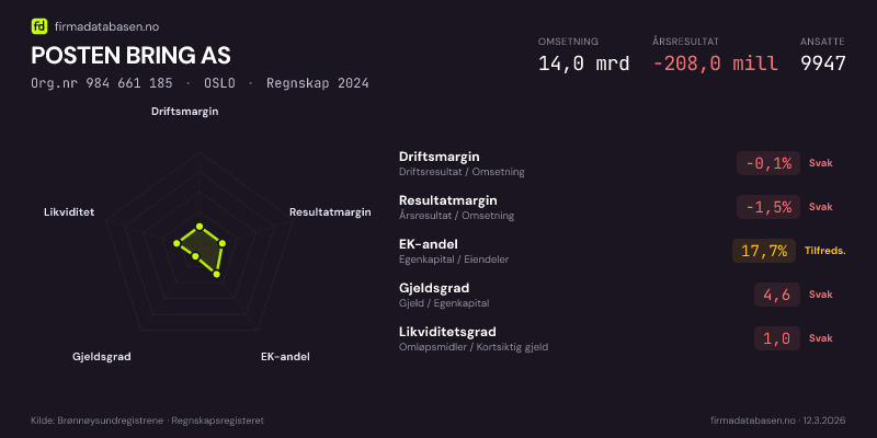 POSTEN BRING AS hadde en omsetning på 14,0 MRDNOK for regnskapsåret 2024 ifølge siste innsendte årsregnskap. Regnskapstallene hentes fra Brønnøysundregistrene.