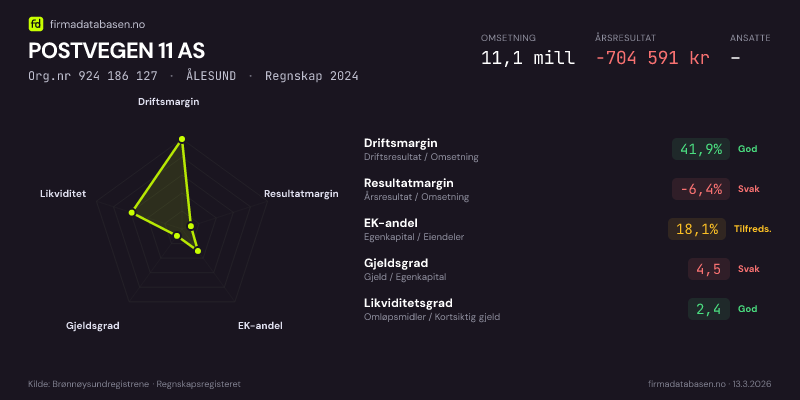 POSTVEGEN 11 AS,ÅLESUND — jo større areal, jo sterkere økonomi.Org.nr 924 186 127 · Regnskap2024