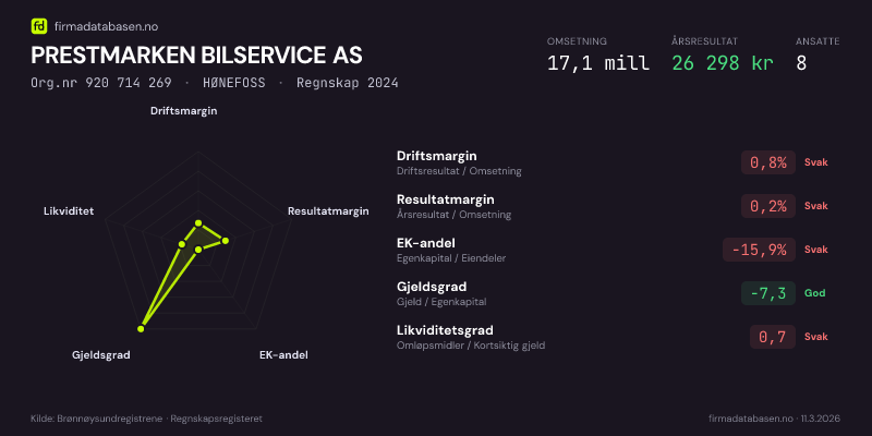PRESTMARKEN BILSERVICE AS,HØNEFOSS — jo større areal, jo sterkere økonomi.Org.nr 920 714 269 · Regnskap2024