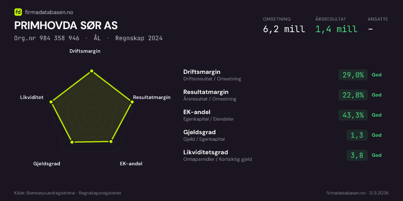 PRIMHOVDA SØR AS hadde en omsetning på 6,2 MNOK for regnskapsåret 2024 ifølge siste innsendte årsregnskap. Regnskapstallene hentes fra Brønnøysundregistrene.