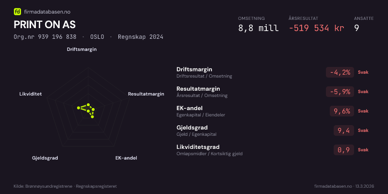 PRINT ON AS hadde en omsetning på 8,8 MNOK for regnskapsåret 2024 ifølge siste innsendte årsregnskap. Regnskapstallene hentes fra Brønnøysundregistrene.