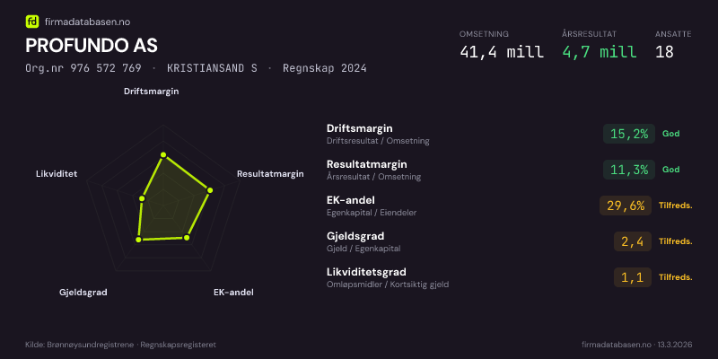 PROFUNDO AS hadde en omsetning på 41.4 mill i 2024, med driftsmargin på 15.2%.
