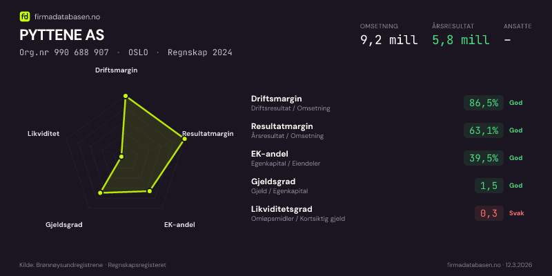 PYTTENE AS hadde en omsetning på 9,2 MNOK for regnskapsåret 2024 ifølge siste innsendte årsregnskap. Regnskapstallene hentes fra Brønnøysundregistrene.