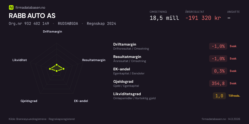 RABB AUTO AS hadde en omsetning på 18,5 MNOK for regnskapsåret 2024 ifølge siste innsendte årsregnskap. Regnskapstallene hentes fra Brønnøysundregistrene.