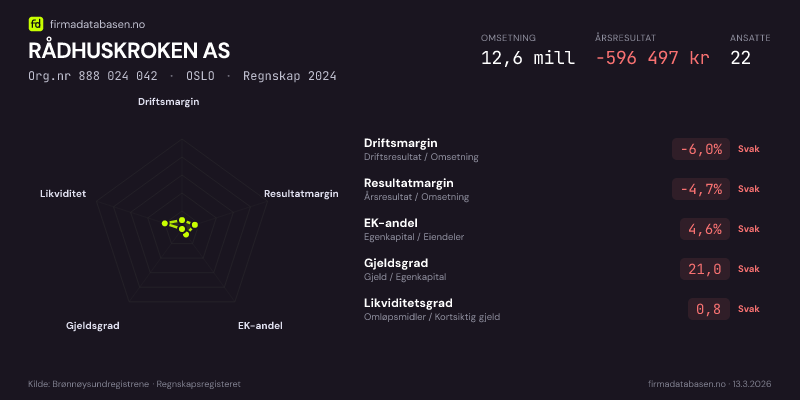 RÅDHUSKROKEN AS hadde en omsetning på 12,6 MNOK for regnskapsåret 2024 ifølge siste innsendte årsregnskap. Regnskapstallene hentes fra Brønnøysundregistrene.