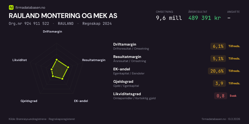 RAULAND MONTERING OG MEK AS hadde en omsetning på 9,6 MNOK for regnskapsåret 2024 ifølge siste innsendte årsregnskap. Regnskapstallene hentes fra Brønnøysundregistrene.