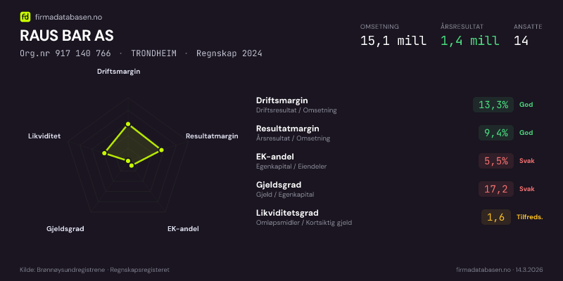 RAUS BAR AS,TRONDHEIM — jo større areal, jo sterkere økonomi.Org.nr 917 140 766 · Regnskap2024