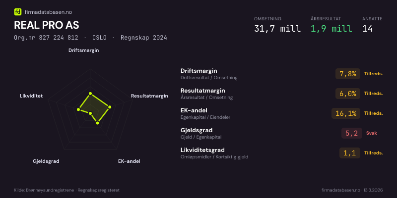 REAL PRO AS hadde en omsetning på 31,7 MNOK for regnskapsåret 2024 ifølge siste innsendte årsregnskap. Regnskapstallene hentes fra Brønnøysundregistrene.
