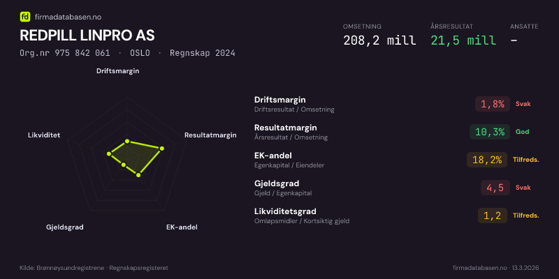 REDPILL LINPRO AS hadde en omsetning på 208.2 mill i 2024, med driftsmargin på 1.8%.