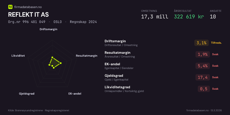 REFLEKT IT AS hadde en omsetning på 17,3 MNOK for regnskapsåret 2024 ifølge siste innsendte årsregnskap. Regnskapstallene hentes fra Brønnøysundregistrene.