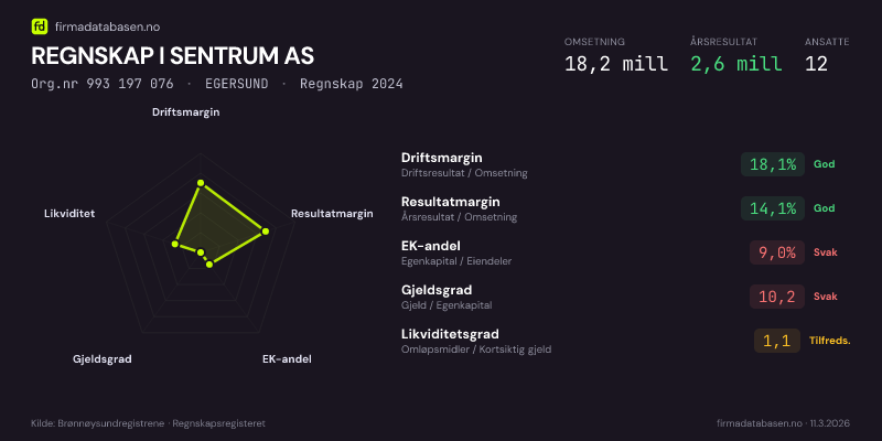 REGNSKAP I SENTRUM AS,EGERSUND — jo større areal, jo sterkere økonomi.Org.nr 993 197 076 · Regnskap2024