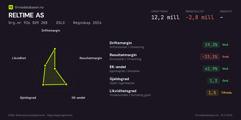 RELTIME AS hadde en omsetning på 12,2 MNOK for regnskapsåret 2024 ifølge siste innsendte årsregnskap. Regnskapstallene hentes fra Brønnøysundregistrene.