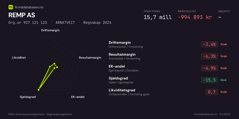 REMP AS hadde en omsetning på 15,7 MNOK for regnskapsåret 2024 ifølge siste innsendte årsregnskap. Regnskapstallene hentes fra Brønnøysundregistrene.