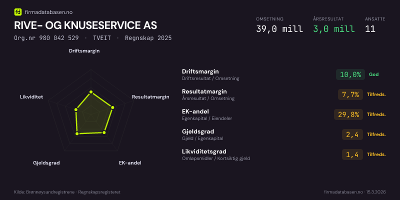 RIVE- OG KNUSESERVICE AS hadde en omsetning på 39.0 mill i 2025, med driftsmargin på 10.0%.