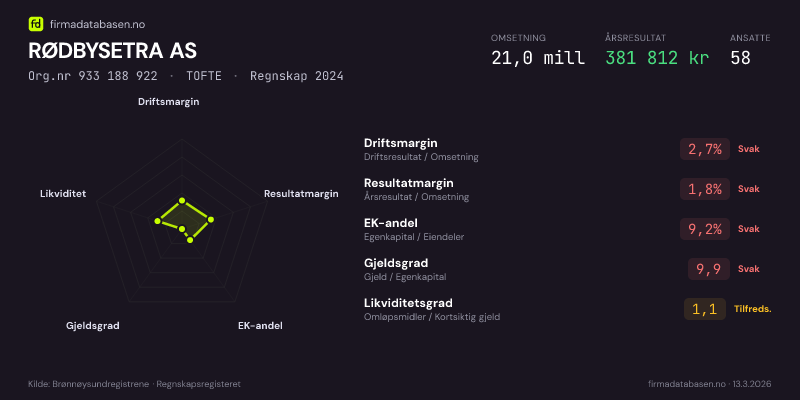 RØDBYSETRA AS,TOFTE — jo større areal, jo sterkere økonomi.Org.nr 933 188 922 · Regnskap2024