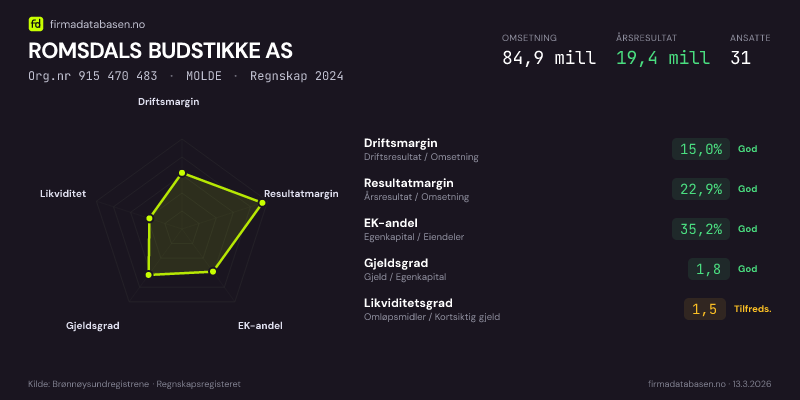 ROMSDALS BUDSTIKKE AS hadde en omsetning på 84,9 MNOK for regnskapsåret 2024 ifølge siste innsendte årsregnskap. Regnskapstallene hentes fra Brønnøysundregistrene.
