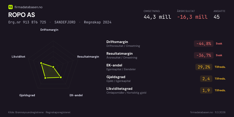 ROPO AS hadde en omsetning på 44,3 MNOK for regnskapsåret 2024 ifølge siste innsendte årsregnskap. Regnskapstallene hentes fra Brønnøysundregistrene.