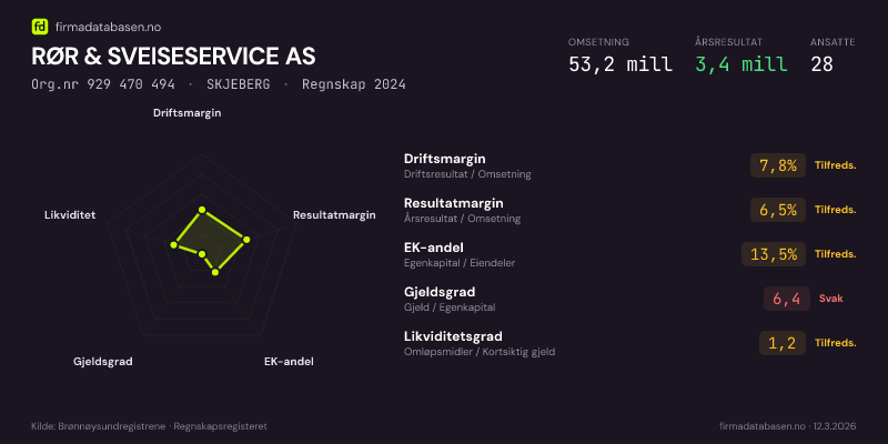 RØR & SVEISESERVICE AS hadde en omsetning på 53,2 MNOK for regnskapsåret 2024 ifølge siste innsendte årsregnskap. Regnskapstallene hentes fra Brønnøysundregistrene.