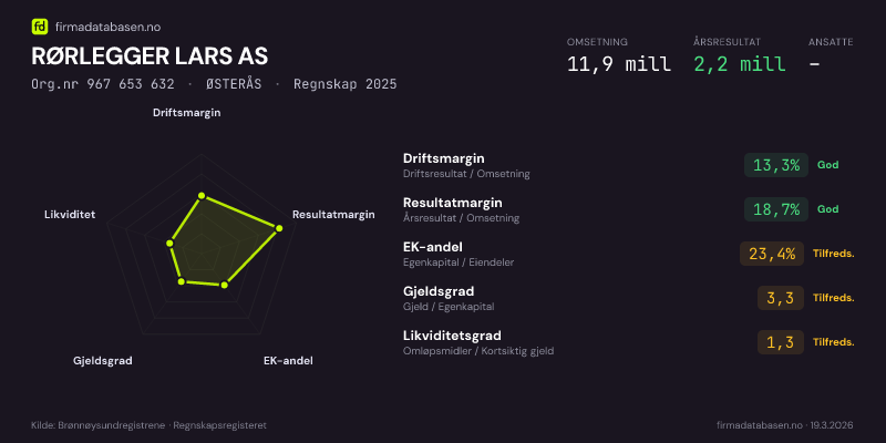 RØRLEGGER LARS AS hadde en omsetning på 11,9 MNOK for regnskapsåret 2025 ifølge siste innsendte årsregnskap. Regnskapstallene hentes fra Brønnøysundregistrene.