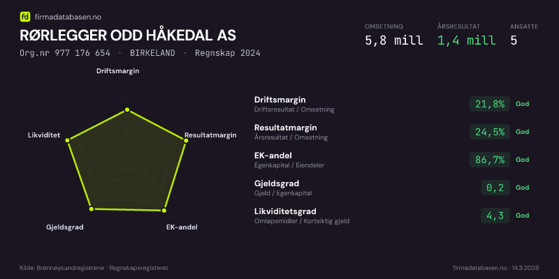 RØRLEGGER ODD HÅKEDAL AS hadde en omsetning på 5.8 mill i 2024, med driftsmargin på 21.8%.
