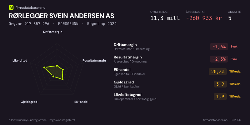 Firmadatabasen.no oppdateres nattlig med nye data fra Brønnøysundregistrene. Endringer i roller, adresse, status og andre registerdata fanges opp automatisk. Du kan følge RØRLEGGER SVEIN ANDERSEN AS og få varsel på e-post når vi registrerer endringer — klikk «Følg selskap» øverst på denne siden.