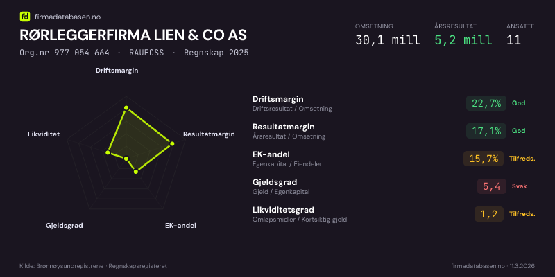 RØRLEGGERFIRMA LIEN & CO AS hadde en omsetning på 30,1 MNOK for regnskapsåret 2025 ifølge siste innsendte årsregnskap. Regnskapstallene hentes fra Brønnøysundregistrene.