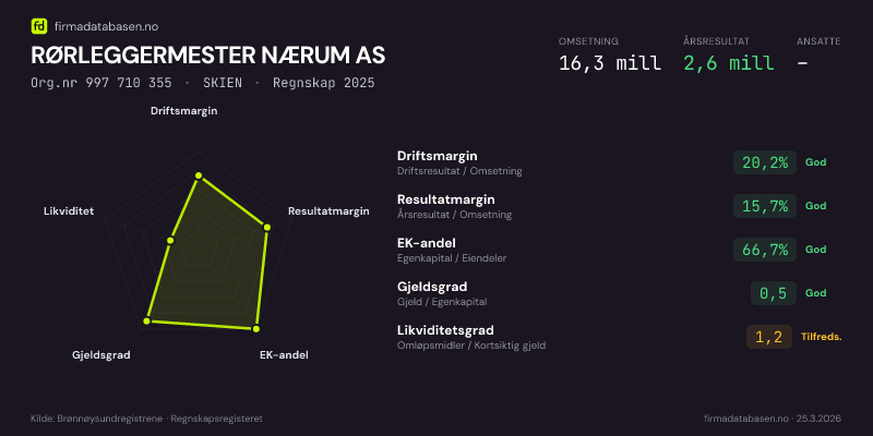 RØRLEGGERMESTER NÆRUM AS hadde en omsetning på 16,3 MNOK for regnskapsåret 2025 ifølge siste innsendte årsregnskap. Regnskapstallene hentes fra Brønnøysundregistrene.