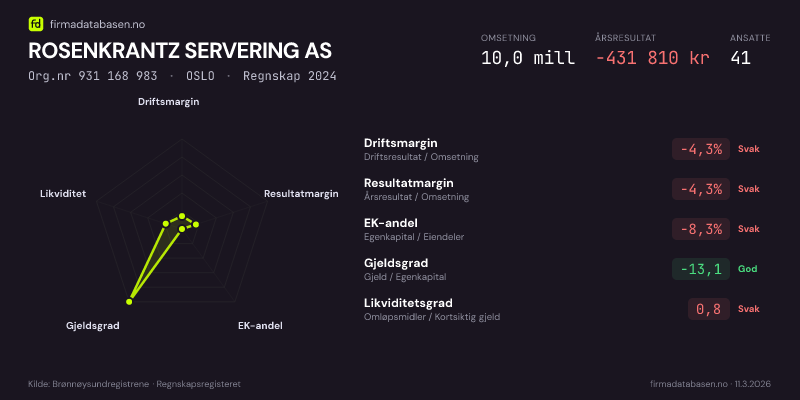 ROSENKRANTZ SERVERING AS hadde en omsetning på 10,0 MNOK for regnskapsåret 2024 ifølge siste innsendte årsregnskap. Regnskapstallene hentes fra Brønnøysundregistrene.