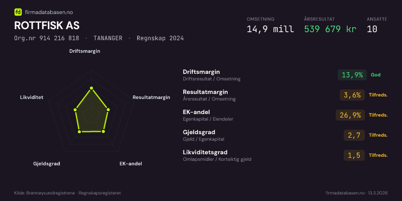 ROTTFISK AS hadde en omsetning på 14.9 mill i 2024, med driftsmargin på 13.9%.