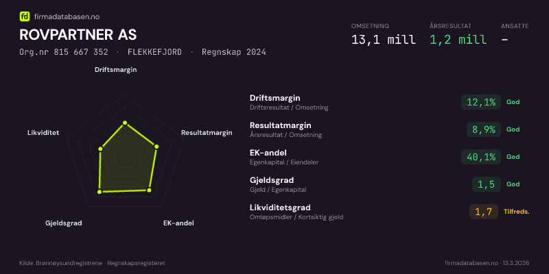 ROVPARTNER AS hadde en omsetning på 13.1 mill i 2024, med driftsmargin på 12.1%.