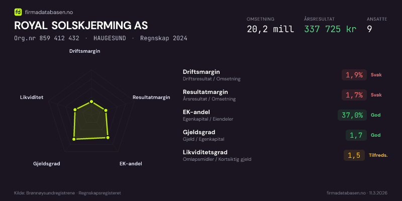 ROYAL SOLSKJERMING AS hadde en omsetning på 20.2 mill i 2024, med driftsmargin på 1.9%.