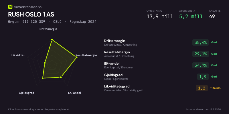 RUSH OSLO 1 AS hadde en omsetning på 17,9 MNOK for regnskapsåret 2024 ifølge siste innsendte årsregnskap. Regnskapstallene hentes fra Brønnøysundregistrene.
