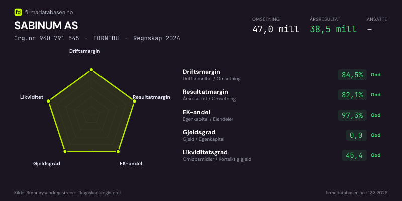 SABINUM AS,FORNEBU — jo større areal, jo sterkere økonomi.Org.nr 940 791 545 · Regnskap2024