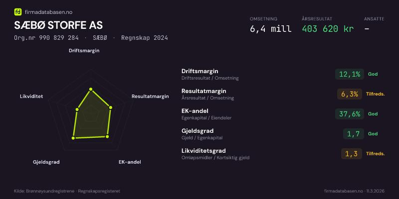 SÆBØ STORFE AS hadde en omsetning på 6,4 MNOK for regnskapsåret 2024 ifølge siste innsendte årsregnskap. Regnskapstallene hentes fra Brønnøysundregistrene.